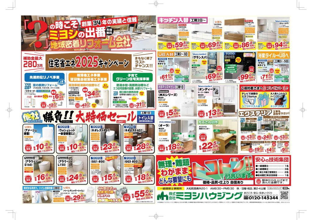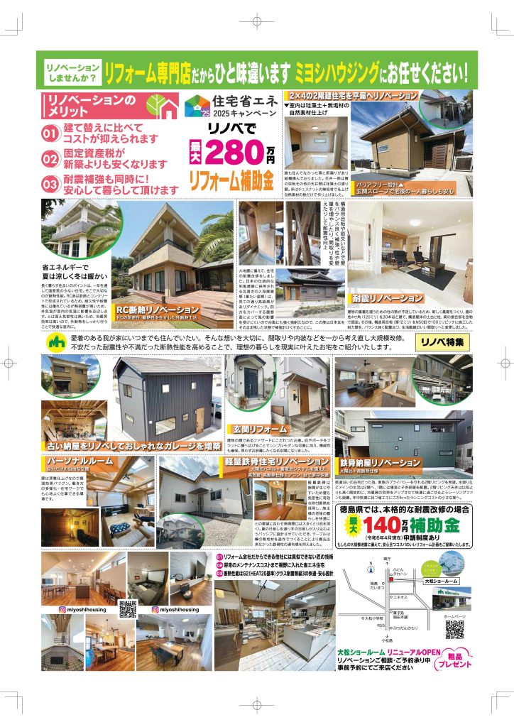 最新チラシ 2025年11月07日 更新 一部ご成約プレゼント付き★ 見積り無料お気軽にご連絡下さい! 投稿ナビゲーション 過去の記事あわわ とくしまの家づくり 一覧へ戻る 施工事例 WORKS 弊社の担当者よりプランのポイントをご説明いたします。ぜひ、リフォームプランを考える際の参考にしてください。 施工箇所・カテゴリー別に見る 増改築リフォーム 耐震・フルリノベーション 新築 内装リフォーム キッチン バスルーム トイレ・洗面 外壁・瓦 外構・エクステリア 耐震・フルリノベーション RC断熱リノベーション 2025年11月14日更新 バスルーム 寒いタイルのお風呂からシステムバスに 2025年11月01日更新 施工事例一覧 ショールームのご案内 SHOWROOM 他社にはない、“見て・触れて・ナットク”をモットーに営業しております。 なかなか触れる機会がない商品なども展示していますよ! お家の事で「?」なことがあれば、分かりやすくご説明しますので ぜひお気軽にお立ち寄り下さい。 大松ショールーム 徳島県徳島市大松町西奥外20-1 ショールームを覗いてみる トップページチラシ・広告・メディア情報最新チラシ TOP ミヨシが選ばれる理由 施工事例 ご依頼の流れ 会社情報 スタッフ紹介 採用情報 ショールーム紹介 よくあるご質問 資料請求・お問い合わせ ショールーム情報 電話をかける お問い合わせ ショールーム Page top