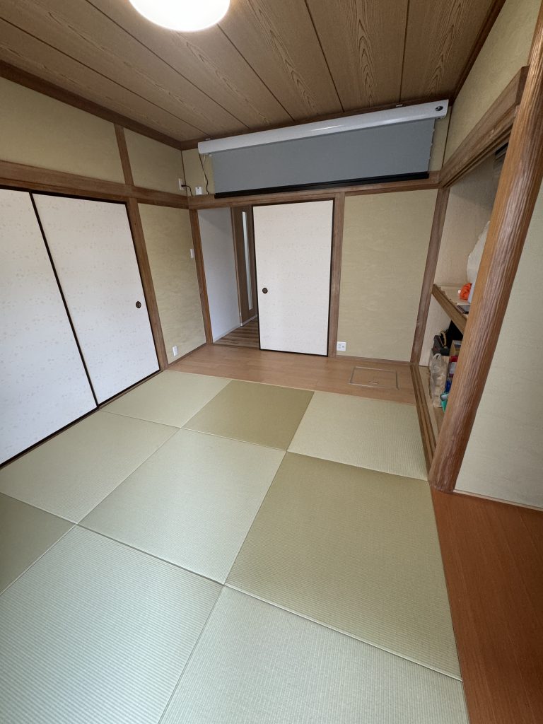 和室のリフォーム | 2025年01月11日 更新 内装リフォーム 御施主様のこだわりが詰まった部屋にリフォームしました。 この施工が完成するまで REPORT 和室を洋室にリフォームすることは多いですが、今回はお施主様のこだわり和室にリフォームしていきます。 2024年09月04日(水) 床の間を一部解体して吊押入の下地をしていきます。 2024年09月05日(木) 吊押入の下地をしてボードをはりました。 2024年09月11日(水) 吊押入を作ります 2024年09月14日(土) クロスを貼って取付けました。 2024年09月17日(火) 畳を撤去して一部板張りにしていきます。 2024年09月28日(土) 残りを琉球畳にして完成です。