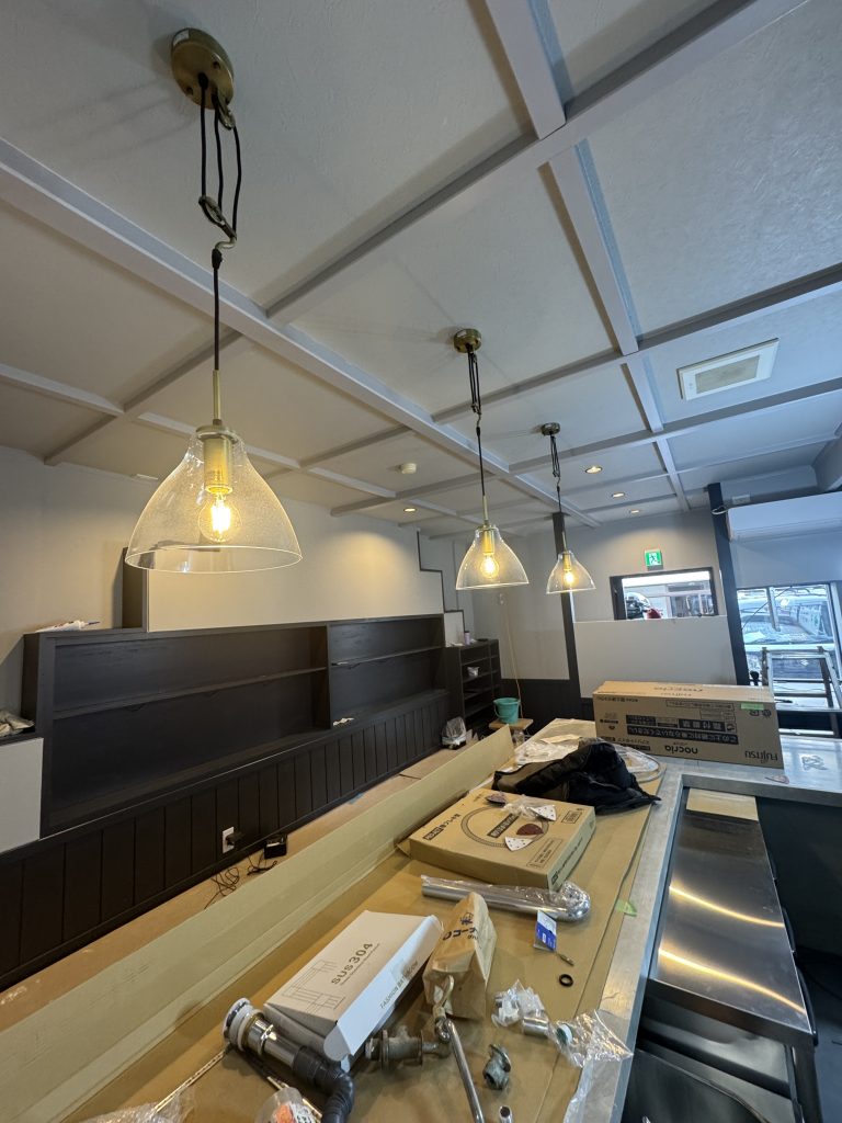 照明の取り付けと厨房機器の搬入をしていきます。