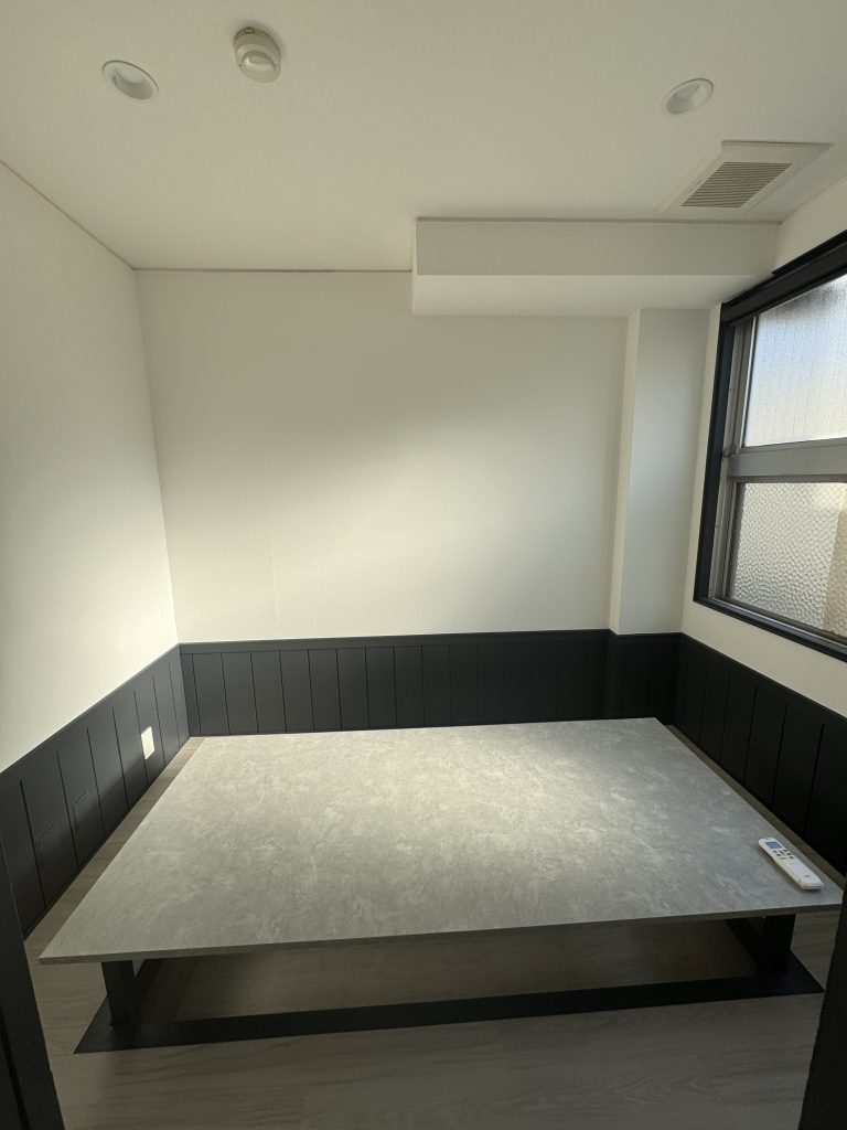 店舗の改装 | 2025年12月12日 更新 内装リフォーム この施工が完成するまで REPORT 2025年12月01日(月) 不要な物を解体して撤去していきます。 2025年12月08日(月) ダウンライトをΦ150→Φ100にするので天井を補修していきます。 2025年12月10日(水) 集成材の棚が出来ました。この棚は後で塗装をします。 2025年12月12日(金) 床の補修と収納をつくります。 2025年12月16日(火) 収納建具までつけて養生しました。 2025年12月26日(金) 木部塗装の下塗りをしていきます。 2025年12月27日(土) 上塗りをしていきます 2026年01月07日(水) タイル面は下地処理して珪藻土を塗っていきます。 2026年01月12日(月) クロスを貼って雰囲気が変わってきました。 2026年01月16日(金) 床はフロアタイルを貼っていきます。 2026年01月21日(水) カウンターは造作して奇麗になりました。 2026年01月24日(土) 個室の机も大工さんに1から作ってもらい塗装していい感じです。 2026年01月27日(火) 照明の取り付けと厨房機器の搬入をしていきます。 2026年01月29日(木) 洗面台やトイレなども取り付けていきます。